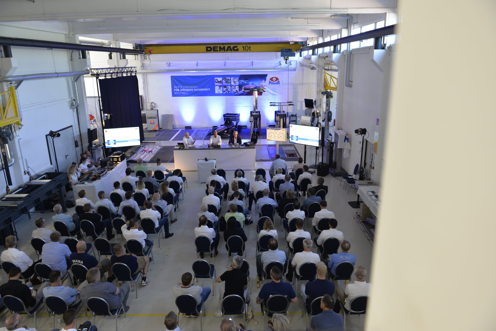 The latest product from MAHA was presented to more than 100 live participants at the MAHA Training Center in Haldenwang on 30 June 2022. For all those invited who were unable to travel in person, there was the option of joining the event digitally. More than 200 online participants took advantage of this opportunity. In total, partners, customers, friends and trade press from over 35 countries followed the unique bilingual event. After the theoretical part of the product launch, the black curtain fell, revealing under fog the star of the day: the CONNECT TRUCK with a yellow US school bus standing for inspection. This allowed the participants to convince themselves personally and virtually of the "10 out of 10 product advantages" that make a compelling case for the purchase of a CONNECT brake tester.
