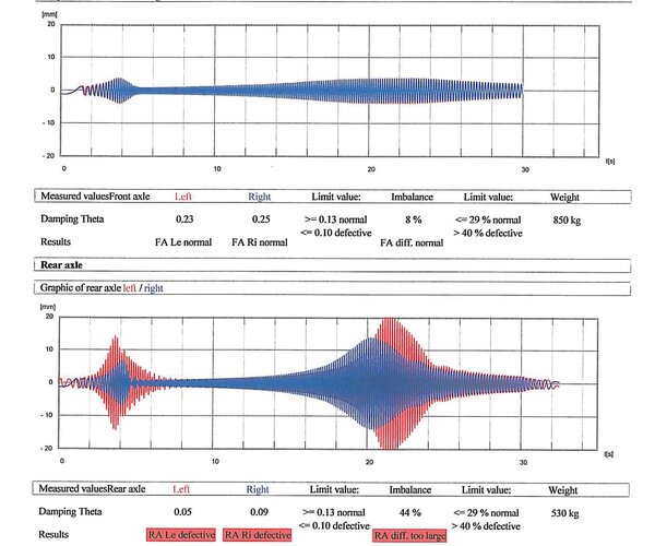 - Frequency-controlled plate excitation by electric motors to determine the maximum vibration amplitude, with subsequent evaluation of axle damping